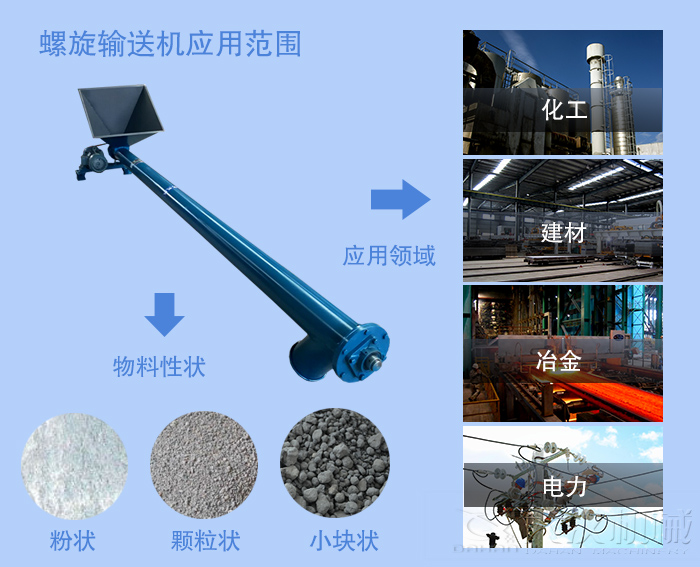 螺旋機廣泛應用于建材,化工,電力,冶金,木炭,糧食等行業(yè)。 它適合水平或傾斜地輸送粉狀,顆粒狀和小塊狀物料,例如煤,灰,渣,水泥和谷物等,輸送物料溫度低于200°C。 螺旋輸送機不適用于輸送容易變質,黏稠和結塊的物料。