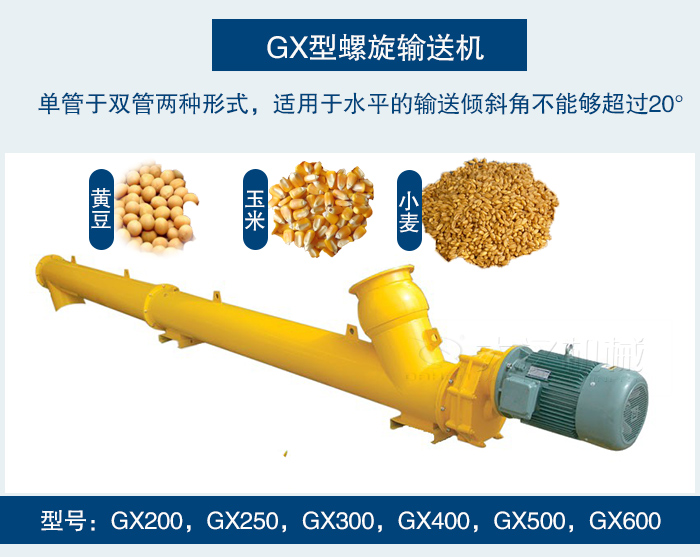 GX型螺旋輸送機(jī)是較老的螺旋輸送設(shè)備,其有單管于雙管兩種形式,適用于水平的輸送傾斜角不能夠超過20°。可輸送一些塊狀的(小塊狀物料)例如:麥子,玉米,黃豆等糧食。