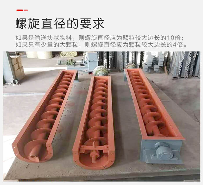 5.螺旋直徑對于絞龍輸送機的螺旋直徑來講,應滿足的要求有:如果是輸送塊狀物料,則螺旋直徑應為顆粒較大邊長的10倍;如果只有少量的大顆粒,則螺旋直徑應為顆粒較大邊長的4倍。
