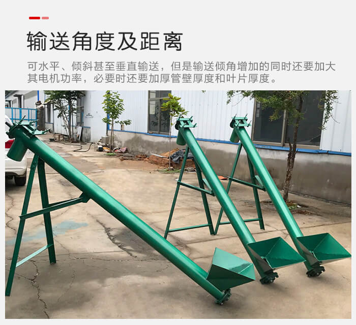 螺旋給料機可以水平、傾斜甚至垂直輸送,但是輸送傾角增加的同時還要加大其電機功率,必要時還要加厚管壁厚度和葉片厚度。