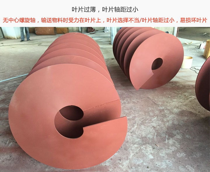 葉片軸距過(guò)小:螺旋槽體選擇不當(dāng),輸送物料的時(shí)葉片軸距過(guò)小,會(huì)造成擠壓力過(guò)大,損傷葉片;若槽體較小,同樣也會(huì)造成壓力過(guò)大,導(dǎo)致葉片損害。