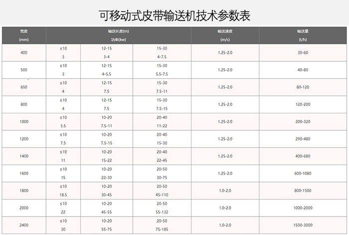 可移動式皮帶輸送機具有快、慢兩種速度、以適應散運、包裝的不同要求,提高了設備的利用,發揮了一機多用的性能。移動式皮帶輸送機有電動、手動升降兩種型式有5米、8米、10米、12米、15米、18米、20米等規格。