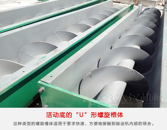 這種類(lèi)型的螺旋槽體適用于要求快速、方便地接觸到輸送機(jī)內(nèi)部的場(chǎng)合。活動(dòng)底的U形螺旋槽體由上部剛性的槽鋼與下部半圓形截面槽上體所構(gòu)成,半圓形截面槽體的一邊為鉸接面,另一邊則采用彈簧卡子夾緊或其他形式能快速打開(kāi)的連接裝置。