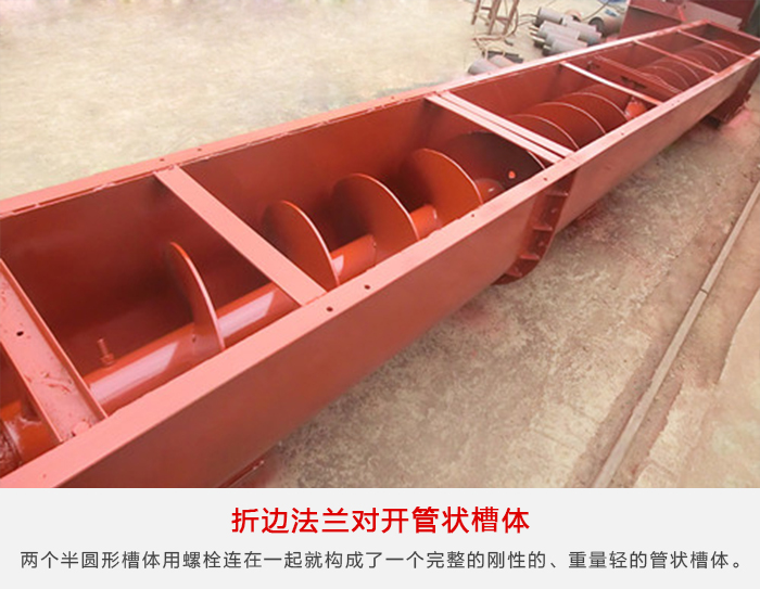 煤粉螺旋輸送機(jī)這種形式的槽體類(lèi)似于角鐵法蘭槽體,但法蘭是由半圓形槽體的同一塊鋼板橋邊加工制成,兩個(gè)半圓形槽體用螺栓連在一起就構(gòu)成了一個(gè)完整的剛性的、重量輕的管狀槽體。